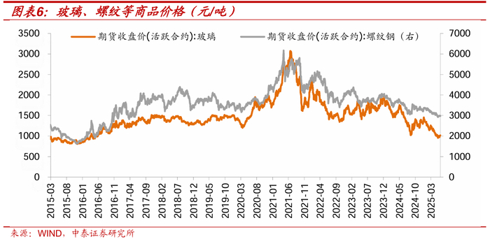 商品价格仍然对供给叙事更敏感,比如近期的焦炭、煤炭等,宏观需求下的交易逻辑可以说持续的缺位。今年以来以螺纹、玻璃为代表的地产链相关商品期货价格仍在持续下跌,截止6月30日跌幅分别为-9%和-24%。