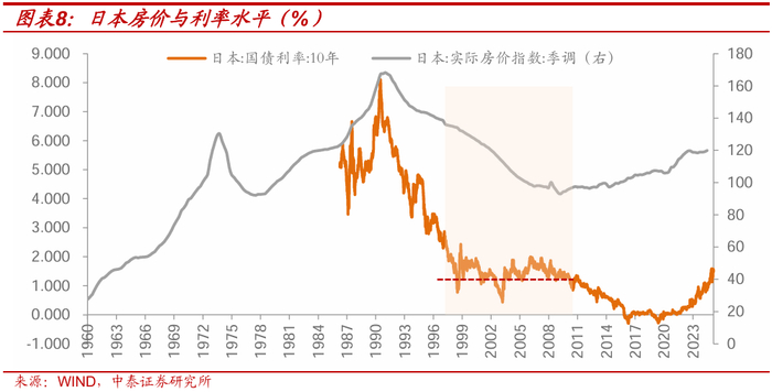 但地产在利率低位后和利率的相关性会明显减弱,这在日本失去的三十年中后期可以得到印证。日本在90年代后期-2010年左右期间,尽管房价仍处于下行通道,但利率中枢却基本没有再发生明显变化,基本在1.0%左右波动,其中还伴随着几轮利率的大幅回调。