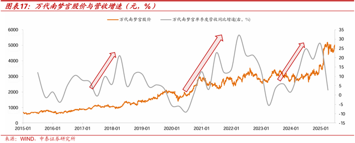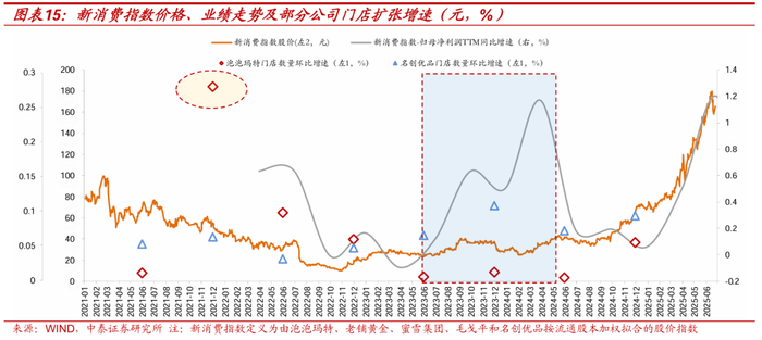 科技以外,新消费在当前表现出的需求增长也可能是过去不断“积分”的结果。如果我们观察新消费整体的业绩增速和板块股价走势,“冲击-响应”的滞后效应或许会更加明显。将构建的新消费股价指数,对比整个板块的归母净利润增速,2023-2024年这一轮的业绩增长就没有很好的反映到股价之中。以部分新消费公司为例:
