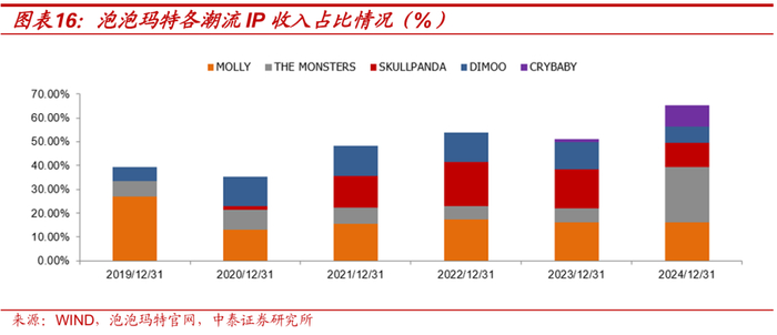 从分IP的收入占比情况来看,从最开始经典IP Molly占据较大份额(2019年占比接近30%),到后续多个IP角色出现带来营收增量,对应的是情绪消费的多元化需求增长,比如DIMOO的份额提升和2022年开始跻身头部热门IP的SKULLPANDA。