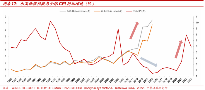 基于前述全球潮玩趋势的“冲击-响应”结构,我们发现“乐高价格”和全球趋势之间也存在分化与滞后。2022年有学者通过调查研究,在论文中构建了乐高价格指数,在1987-2015年样本期间,乐高投资的平均回报率至少在11%,在表现上优于大盘股、债券和黄金投资等,从价格走势来看,2012年后乐高价格出现大幅上涨,但同时全球CPI增速却出现滑坡,直至2020年之后才出现大幅抬升。
