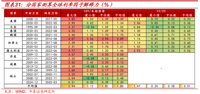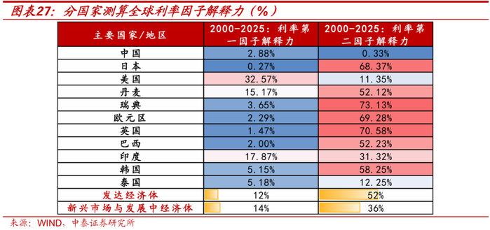 分国家来看,除我国以外,海外主要国家政策利率中枢相较于2022年以前已经明显抬升。具体来看,第二因子的中枢抬升缓于第一因子,且在全样本区间中主要国家的利率走势受第二因子的解释程度更高,比如日本和欧洲国家,解释力多数在50%以上,而美国则与第一因子更为相关,先于第二因子的利率水位表现上升。