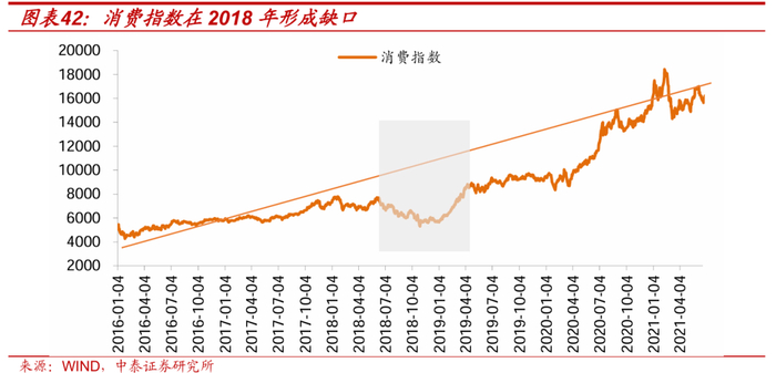 以2018年为例,在2016年到2020年中以食品饮料和机构牛市的大行情下, 2018年的关税带来了一个巨大缺口,但随着外因的影响逐渐褪去,缺口被补齐,消费的内生趋势并没有改变。