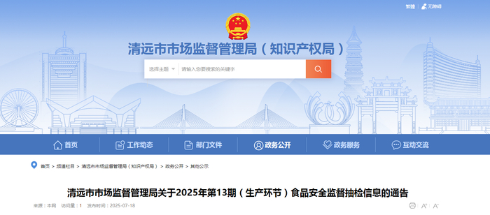 广东省清远市市场监督管理局关于2025年第13期(生产环节)食品安全监督抽检信息的通告