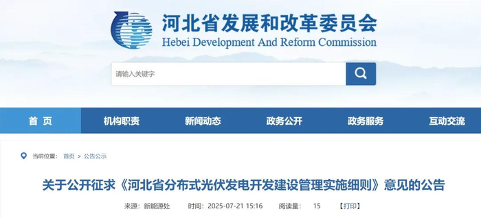 为促进我省分布式光伏健康可持续发展,助力构建新型电力系统,我委起草了《河北省分布式光伏发电开发建设管理实施细则》,现将征求意见稿予以公告,向社会公开征求意见。欢迎各界人士结合分布式光伏发电行业发展、《反垄断法》、《公平竞争审查条例》、《公平竞争审查条例实施办法》以及合法性合理性等内容,积极提出意见建议。