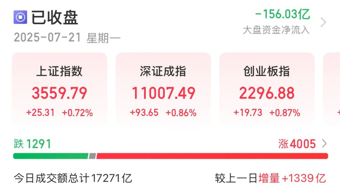 截至收盘,沪指涨0.72%报3559.79点,深证成指涨0.86%报11007.49点,创业板指涨0.87%报2296.88点,北证50指数涨2.38%,全市场超4000只个股上涨,逾百股涨停。