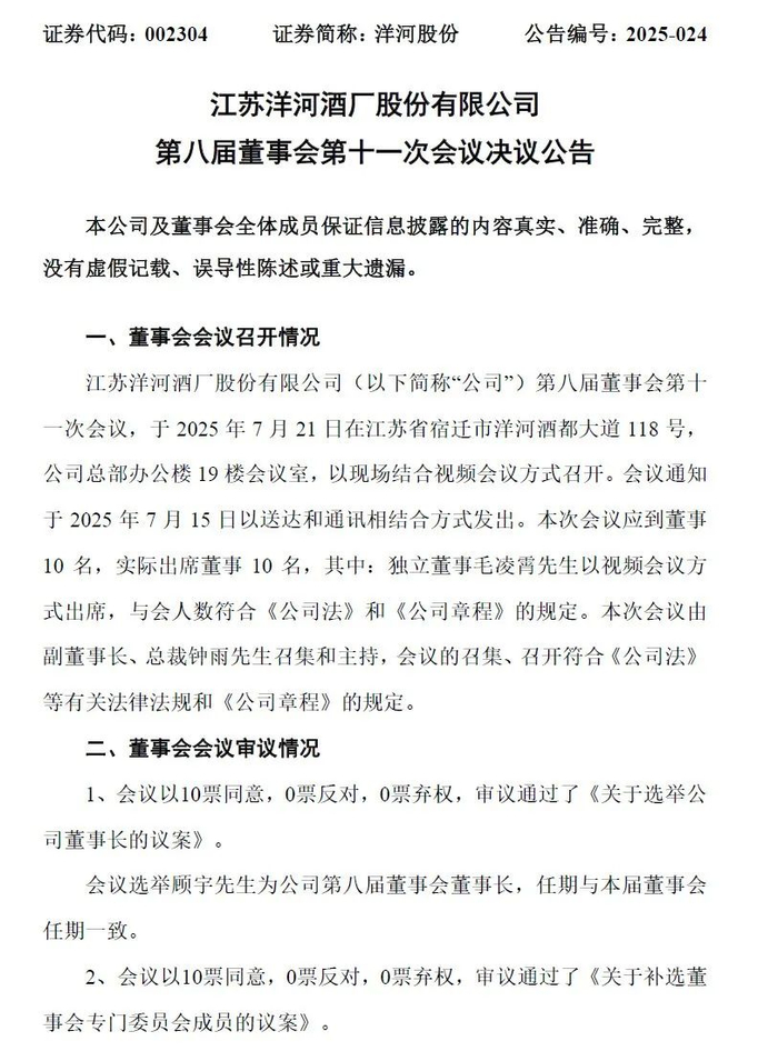 另据同日公告,洋河股份于当日召开董事会会议,选举顾宇为公司第八届董事会董事长,及第八届董事会战略委员会主任委员和提名委员会委员,任期与本届董事会任期一致。