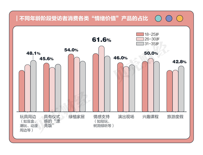 年轻群体正在将情绪调节视为生活的刚需,约56%的受访者愿意为“情感支持”买单,如陪玩服务、树洞倾听等。分年龄段看,26-30岁的受访者对“情感支持类”产品表现出最大的消费兴趣,61.6%都选择此类产品作为情绪价值的消费之一。