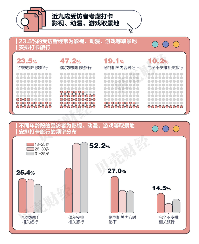 在兴趣驱动的出行浪潮中,“为影视、动漫、游戏打卡”正从粉丝专属行为,演变为一种轻量化、情绪驱动的日常社交表达方式。调研显示,近九成受访者表示会考虑打卡影视、动漫、游戏的取景地,相关内容也正在社交平台形成“同频共感”的传播场。