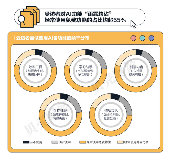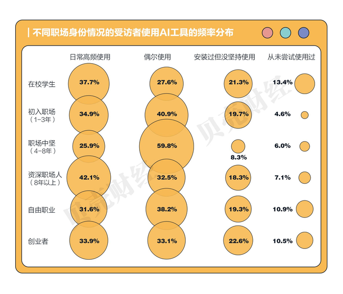 新京报贝壳财经调研发现,当前高频使用AI工具的用户中,18-25岁人群占据主力。而这个年龄段恰好对应本科在读与应届毕业生群体——也是从“ChatGPT横空出世”到“AI工具成为日常必需”全过程里成长起来的AI原生一代。