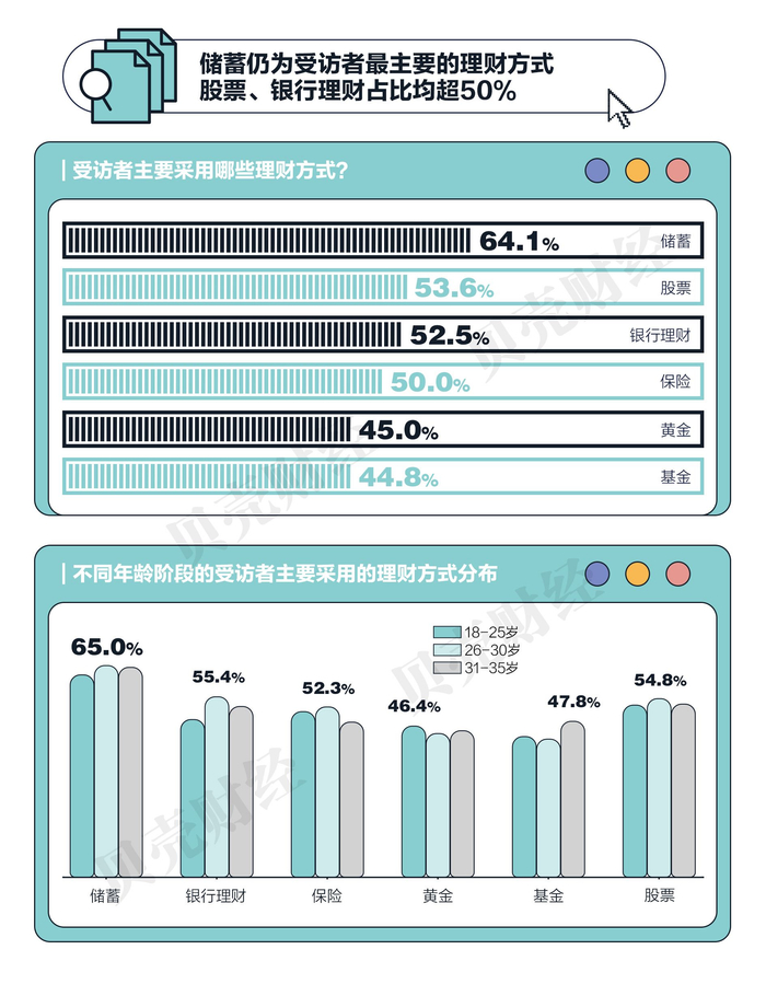 调查显示,受访者的各项理财方式占比均超过了40%。其中,储蓄仍是最主要的理财方式,占比达到64.05%。股票、银行理财、保险占比均达到或超过50%。年轻人在追求资产稳健增长的同时,也逐步接纳了多元化理财配置。