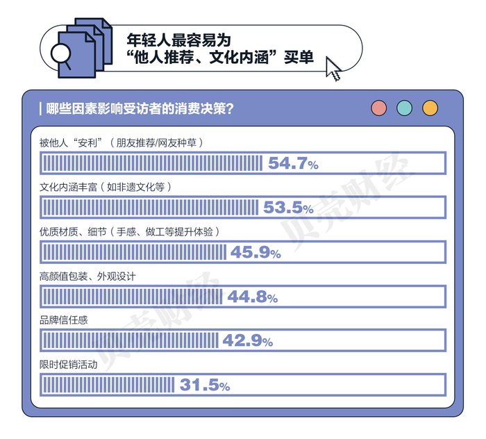 调查显示,近55%的受访者会因为被朋友或网友推荐而消费,这也是占比最高的消费因素,显示出当下社交影响力对消费行为的强大驱动力。文化内涵丰富(如非遗等)成为影响消费决策的第二大因素,消费者越来越看重商品背后的价值认同和精神共鸣。
