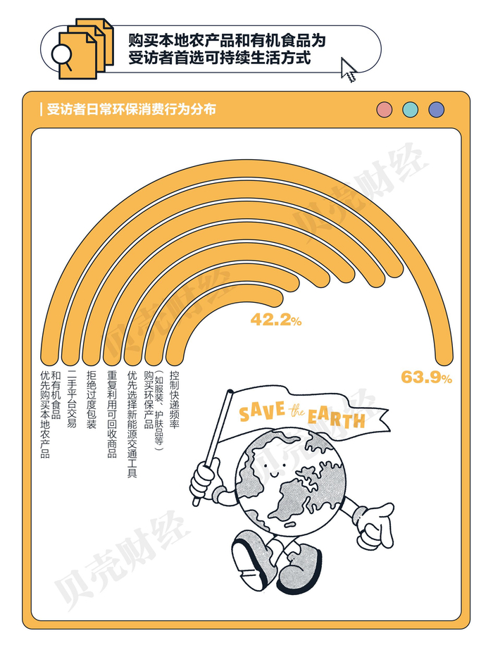 近64%的受访者选择购买本地农产品和有机食品,这也是调查中最受欢迎的环保消费方式。这不仅符合绿色低碳理念,也体现了消费者对“产地透明、安全健康”产品的青睐。