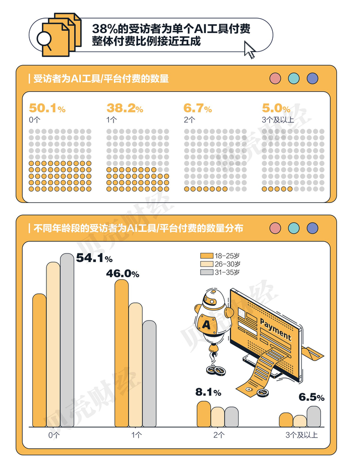 AI技术的快速渗透正在全面改变年轻人的生活节奏与决策模式。报告显示,近50%的18-25岁人群已为AI工具付费,38%至少为1个AI平台付费,成为“AI原生代”的核心力量。