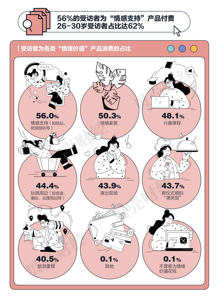 新京报贝壳财经发起的调研结果显示,99.9%的受访者均会为情绪价值付费。在情绪价值消费所列的选项中,所有的勾选占比都超过了40%,情绪价值消费正在成为主流消费动机之一。