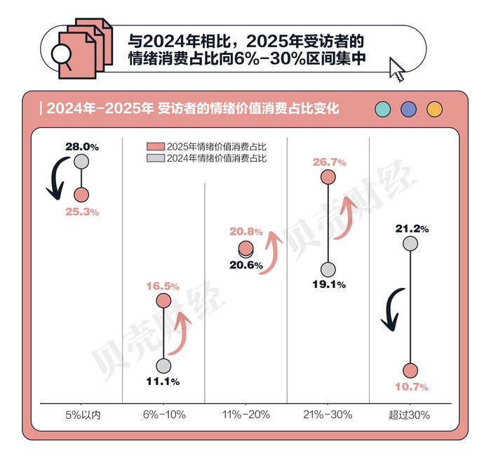 调查显示,与去年相比,今年的情绪价值类消费在总体支出中的占比结构发生了显著变化。今年受访者的情绪消费占总支出比重向“中间地带”集中,呈现普遍化的趋势。
