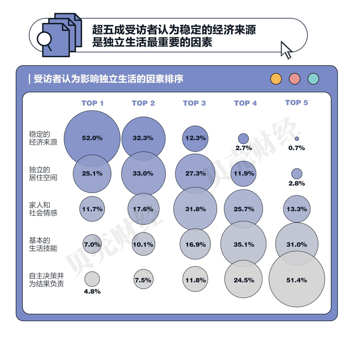 稳定的经济来源,依然是独立生活最重要的前提。超52%受访者将其排在独立生活因素首位,遥遥领先其他选项。