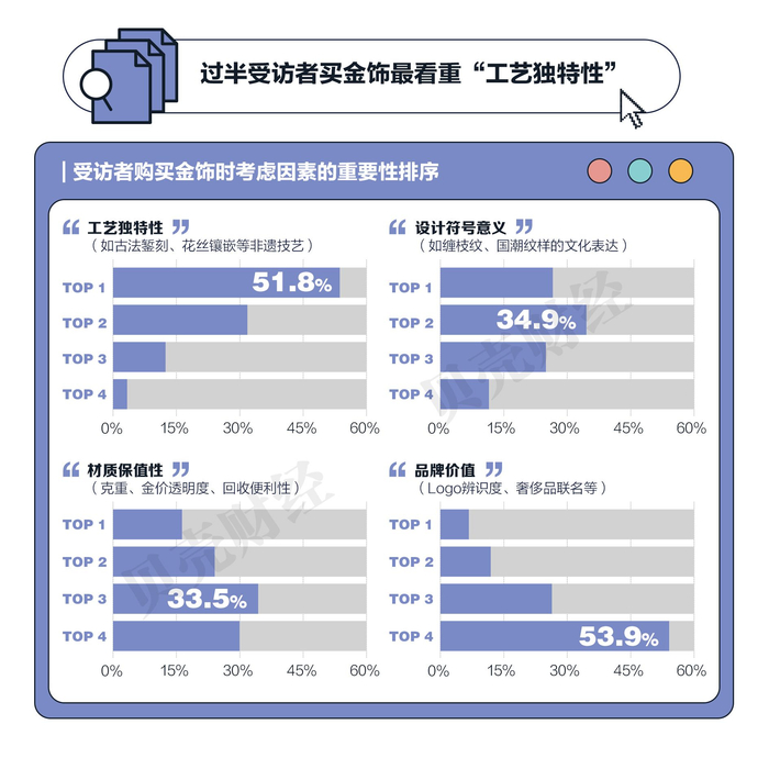 此外,黄金饰品市场中年轻人对“非遗工艺”与“文化认同”的强烈偏好,说明“文化价值”正成为购买驱动力。黄金品牌以“3D硬金+传统技艺”结合的产品策略成功打动25-34岁人群,超过51%的消费者在购买金饰时将“工艺独特性”放在首位。
