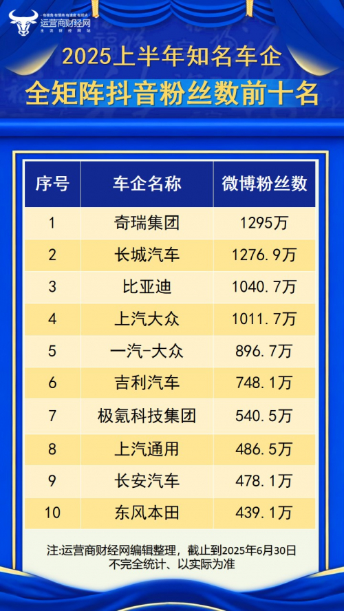 日前,国内主流财经媒体运营商财经网发布“2025上半年知名车企全矩阵抖音粉丝数前十名”榜单,在流量与营销的竞争中,哪些车企在抖音平台获得了高度曝光?