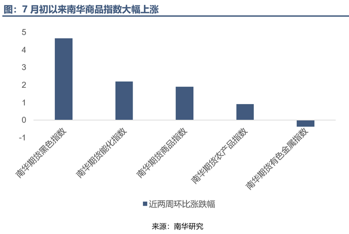 7月份以来,南华商品指数触底反弹,其中分板块指数涨幅较大,南华黑色指数环比月初上涨4.66%,南华能化指数、南华金属指数、南华农产品指数环比月初上涨超2%。我们认为,本次反内卷式的产业政策调整与去产能式的产业政策调整区别大于联系。因此,对于国内经济发展、大宗商品市场的影响也更加深远。