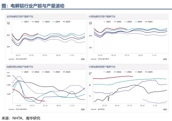 电解铝作为国内供给侧改革最为成功的品种之一,相较于此次反内卷方案涉及的其他品种来说,4500万吨产能红线使得行业整体处于紧平衡或略微紧缺的状态,据SMM统计当前电解铝年化运行产能为4383万吨,开工率为95.94万吨,全行业并不存在过剩产能。对铝供给端来说,从能效水平来看,有差不多10%产能是低于基准能效水平的,但考虑到自2024年起,国家已开展节能降碳行动方案,低能效水品项目在近两年陆续产能置换和技改,后续一刀切喊停概率较小。氧化铝和电解铝不同,从数据上来看,根据SMM统计目前氧化铝开工率为80.74%,在开工率不高的情况下,氧化铝和电解铝周度产量比例也已2.03,行业产能明显过剩。同时氧化铝超10年产线结构占比约为45%,但老旧产能和落后产能并不能划等号,氧化铝厂持续会有技术改造且近几年新投产能较多,落后产能占比或大幅低于45%这个数值。我们认为此次反内卷对铝产业供应端采取的措施或将类似3月发布的《铝产业高质量发展实施方案(2025—2027年)》主要侧重于对未来新建项目的审批上。