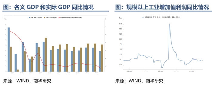 展望下半年,经济运行仍面临一些压力值得关注。一方面,居民需求依旧偏弱,二季度名义GDP与实际GDP增速的差值边际扩大,导致宏观数据与微观体感的差距有所拉大;另一方面,企业端利润增速仍处于负值区间,部分行业出现产能过剩现象,制约了企业的良性发展。
