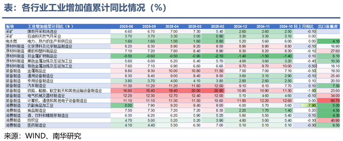 1)从生产端观察,除原材料制造业中的非金属矿物制品业工业增加值同比增速持续保持负值外,食品制造、电气机械、汽车制造、电子通信等行业的增速相较于整体工业水平而言并不低。值得注意的是,这些行业的产能利用率处于历史低位,但工业增加值增速并未出现大幅下滑。这种结构性矛盾的存在,意味着需要政策层面进一步发力,推动过剩产能加速出清。而本次“反内卷”政策的出台,或将成为助力相关产业治理产能过剩的重要契机。