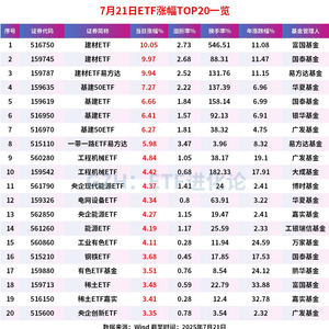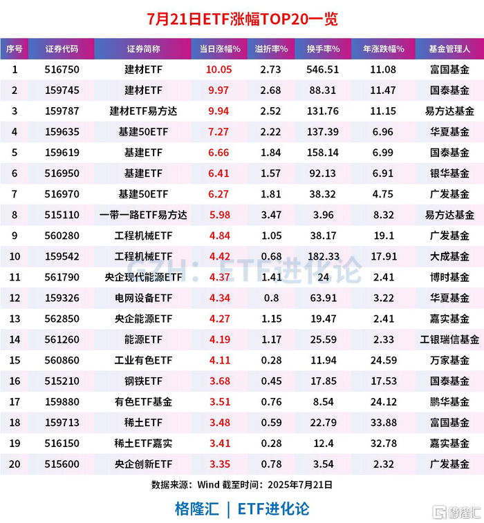 ETF方面,建材板块飙涨,富国基金建材ETF、国泰基金建材ETF和建材ETF易方达涨停,最新溢折率分别是2.73%、2.68%和2.52%;基建板块跟随上攻,华夏基金基建50ETF、国泰基金基建ETF、银华基金基建ETF和广发基金基建50ETF分别涨7.27%、6.66%、6.41%和6.27%。