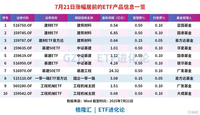 从规模来看,跟踪建筑材料指数的ETF中,规模最大的是国泰基金建材ETF,最新规模为6.85亿元,建材ETF易方达则是费率最低的ETF,管理费率+托管费率仅为0.2%/年,处于市场成本最低一档。