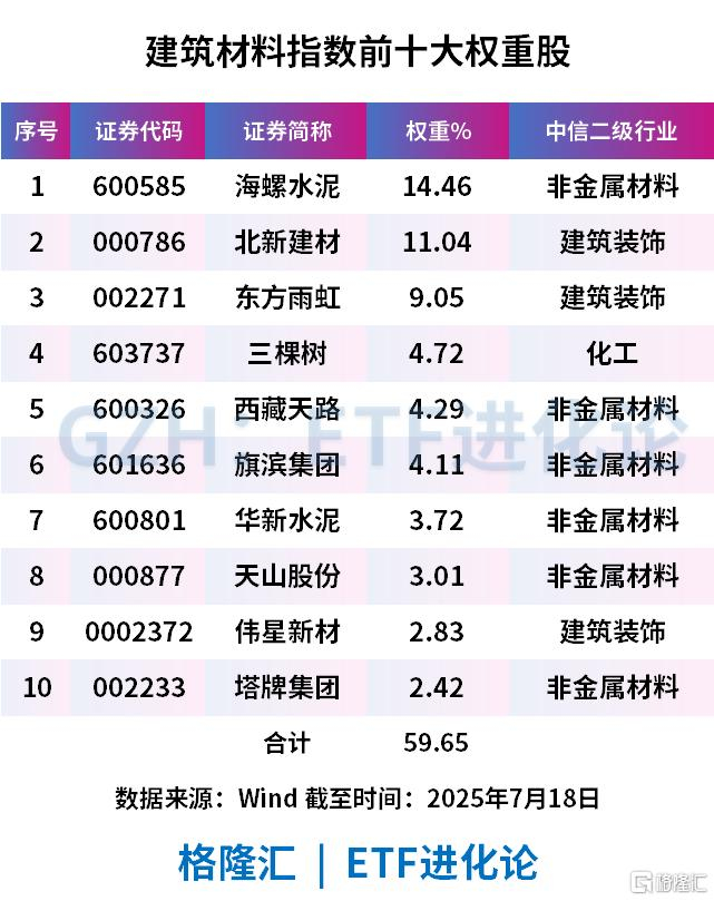 该指数前十大权重股分别是海螺水泥、北新建材、东方雨虹、三棵树、西藏天路、旗滨集团、华新水泥、天山股份、伟星新材、塔牌集团。