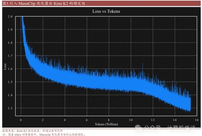 底层技术创新提升训练稳定性:月之暗面团队自研“MuonClip”优化器,克服“训练崩溃”问题。根据其技术报告,MuonClip通过一种创新的“qk-clip”技术,在训练过程中动态调整权重,有效防止了注意力分数的爆炸,从而确保了在15.5万亿tokens的庞大数据集上训练过程的“零不稳定”。这一底层工程和算法的突破,是Kimi K2能够成功问世的核心技术保障之一。