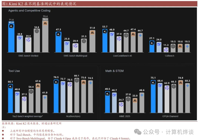 综上,我们认为Kimi K2的发布标志着中国AI公司在大规模语言模型领域的重大突破,展示了其在万亿参数模型训练、MoE架构设计和代码能力方面的技术实力,同时也反映了开源AI模型在中国的快速发展和广泛应用。在OpenAI等巨头对核心模型愈发封闭的背景下,Kimi K2开源策略既能迅速吸引全球开发者的关注和使用,构建起一个庞大的开发者生态,亦能挑战顶级闭源模型的技术护城河,为开发者和企业提供了高性价比的替代方案。