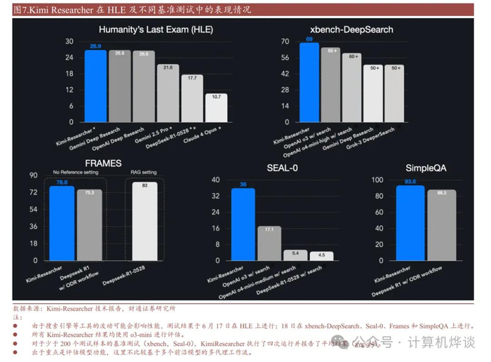 Kimi-Researcher在应用场景、成本、生态全方位撬动市场格局。在Kimi K2发布前夕,Kimi发布Agent产品 Kimi-Researcher。其作为Moonshot AI在2025年6月底开启内测的垂直场景应用产品,其底层模型当前调用K1.5,通过K1.5的Agent能力,自动完成复杂研究任务,并输出交互式内容,而非传统文本对话。目前,Kimi Researcher在Humanity’s Last Exam (HLE)中获得了26.9%的Pass@1分数,Pass@4 准确率为40.17%。此外,在xbench-DeepSearch上实现了69%的通过率。在多轮搜索推理FRAMES,Seal-0和事实信息SimpleQA的基准测试中,Kimi-Researcher也取得了很好的表现。后续,随着Kimi K2模型的推出,Kimi-Researcher能力也将更上一层楼。
