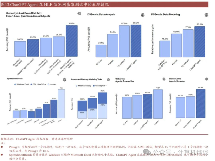 ChatGPT Agent实现从问答机器人到通用AI代理的跨越,能够完成复杂任务。在HLE中,支持ChatGPT Agent的模型在该评估中的Pass@1分数为41.6。在旨在评估智能体在涵盖数据分析和建模等现实数据科学任务中表现的DSBench测试中,ChatGPT Agent显著超越了之前的最先进模型,尤其在数据分析任务中,其表现优于人类水平。在定位于评估模型在处理基于真实世界场景的电子表格编辑任务时的表现的SpreadsheetBench平台中,ChatGPT Agent也取得了SOTA,其性能较当前行业领先的GPT‑4o提升了超过一倍。当具备直接编辑电子表格的能力时,ChatGPT Agent的得分进一步提升至45.5%,大幅超越Copilot in Excel。在内部基准测试中展现出入门级投资银行分析师(1-3年工作经验)的能力,在Inverstment Banking Modeling Tasks测试中优于Deep Research和o3模型。