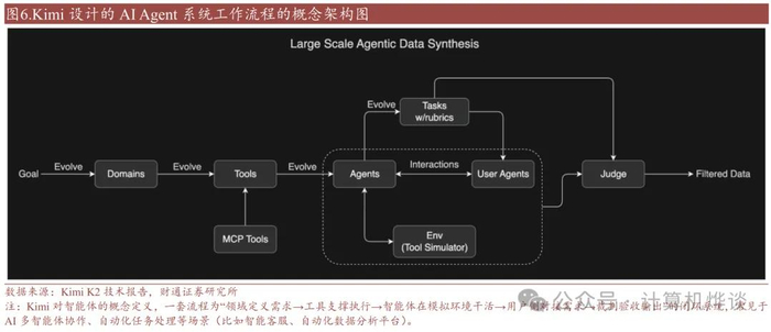 Kimi K2具有庞大参数规模与高效MoE架构,擅长执行自动化工作流长任务。Kimi K2采用了混合专家(Mixture-of-Experts, MoE)架构,总参数量高达1万亿,在处理每个任务时激活约320亿参数。在模拟真实世界软件开发任务的SWE-bench上,Kimi K2的性能与闭源模型Claude 4 Opus非常接近;而在衡量实时互动编程能力的LiveCodeBench上,Kimi K2以53.7%的准确率超越了GPT-4.1和Claude 4 Opus。我们认为,综合以上数据,Kimi K2尤其擅长执行具体的、定义明确的计划,是构建自动化工作流的理想“执行者”。