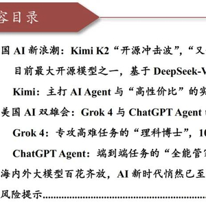 中国AI新浪潮:Kimi K2“开源冲击波”,“又一个DeepSeek时刻”。2025年全球AI高速发展,中美大模型竞争激烈。7月11日Moonshot AI发布的Kimi K2开源模型成焦点,被视为中国AI差异化竞争策略,获“又一个DeepSeek时刻”评价,标志中国开源大模型具世界级竞争力。该模型采用MoE架构,总参数量1万亿,激活参数约320亿,以“智能体潜能”见长,编码能力突出。技术上优化自DeepSeek-V3,擅长执行明确计划,是自动化工作流理想“执行者”,聚焦编码等场景极致表现。此前Kimi推出内测产品Kimi-Researcher,依托K1.5的Agent能力完成复杂研究,多项基准测试成绩良好,K2推出后其能力将升级。K2开源且API定价极低,远低于同类产品,通过低成本吸引开发者构建生态,未来可通过企业服务等盈利。综上,K2标志中国AI在大模型领域重大突破,开源策略能吸引开发者、挑战闭源巨头,提供高性价比替代方案。