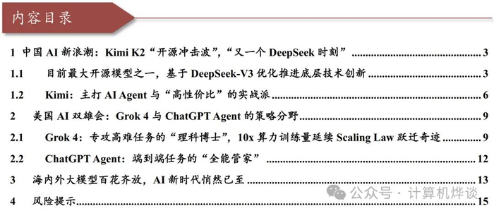 月之暗面Moonshot AI发布Kimi K2基座模型吹响“又一个DeepSeek时刻”。2025年,全球人工智能领域持续经历着前所未有的高速发展与激烈竞争,中美大模型研发和产品迭代尤为引人注目。近日,一批业内领先的AI大模型相继涌现,正深刻地改变着人机交互的方式,并有望在各行各业催生创新应用。7月11日,Moonshot AI发布Kimi K2开源模型,成为全球AI领域的一大焦点。我们认为,它不仅是性能强大的模型,更代表中国AI力量在全球竞争中采取的一种差异化、高影响力的策略。Kimi K2的出现,被业界评价为“又一个DeepSeek时刻”,标志着中国在开源大模型领域已具备世界级的竞争力。