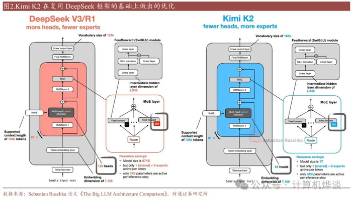 总结来看,K2技术团队在DeepSeek-V3原有框架基础上进行优化,通过减少“注意力头”来降低服务器压力,同时增加专家数量以补回效果损失;此外还精简了前期固定层,仅保留一层,并让专家调度更灵活,取消分组搭配,从而使组合方式更多样,效果也更好。