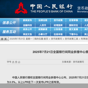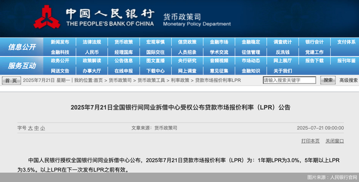 新一期贷款市场报价利率(LPR)出炉。7月21日,中国人民银行授权全国银行间同业拆借中心公布,2025年7月21日LPR为:1年期LPR为3%,5年期以上LPR为3.5%。人民银行指出,以上LPR在下一次发布LPR之前有效。