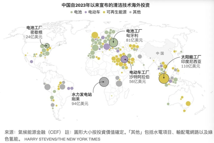 从2000年以后开始,中国开始重构全球能源版图。根据研究机构气候能源金融的数据,自2023年以来,中国企业宣布的在海外清洁能源制造、发电和输电领域的投资达到1680亿美元。