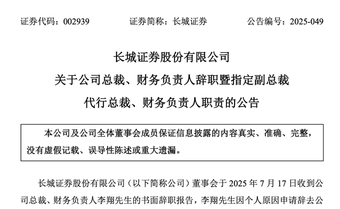 2025年7月17日,长城证券董事会收到公司总裁、财务负责人李翔先生的书面辞职报告。李翔先生因个人原因申请辞去公司总裁及财务负责人职务,辞任后将不在公司及公司控股子公司担任任何职务。依据相关法律法规及《公司章程》规定,李翔先生的辞职自辞职报告送达公司董事会时便已生效。值得注意的是,截至公告披露日,李翔先生未持有公司股份。