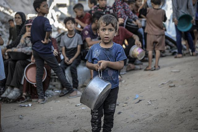 当地时间2025年7月20日,加沙城,在以色列的封锁和持续袭击下,一名儿童等待分发食物。