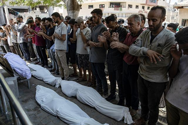当地时间2025年7月20日,加沙城,人们在加沙城希法医院为在食品分发点被枪杀的遇难者祈祷。