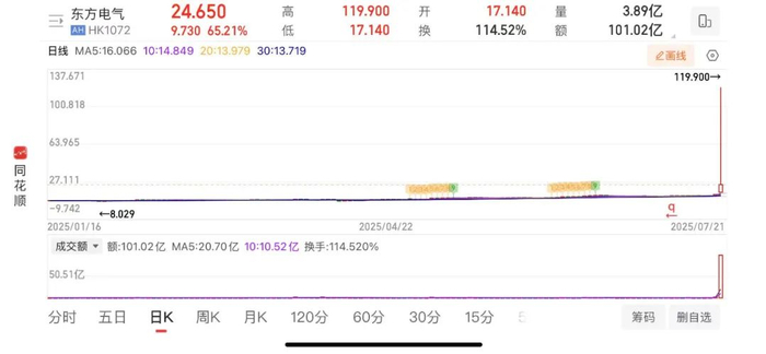 东方电气更为夸张,开盘即从竞价的17.14港元,直接飙升至119.90港元(涨幅为703.62%),随后涨幅快速回到,成交价回到20.85港元附近。从成交来看,在9时30分22秒出现一笔异常交易,以119.90港元/股成交了400股,较上一笔19.32港元/股上涨了520%。有可能是有交易员出现乌龙指,将19.90港元误输入为119.90港元。东方电气港股收盘涨幅为65.21%,收盘价为24.65港元。