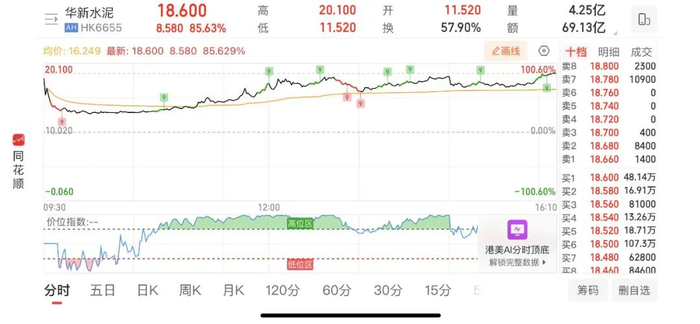 其中华新水泥开盘就从竞价的11.52港元(涨幅15%以内)直接飙升到20.10港元(涨幅超过100%),然后快速回落到涨幅26%左右,不过,今天的华新水泥也没怎么套人,因为股价随后一路震荡走高,收盘涨幅为85.63%,收盘价为18.60港元。