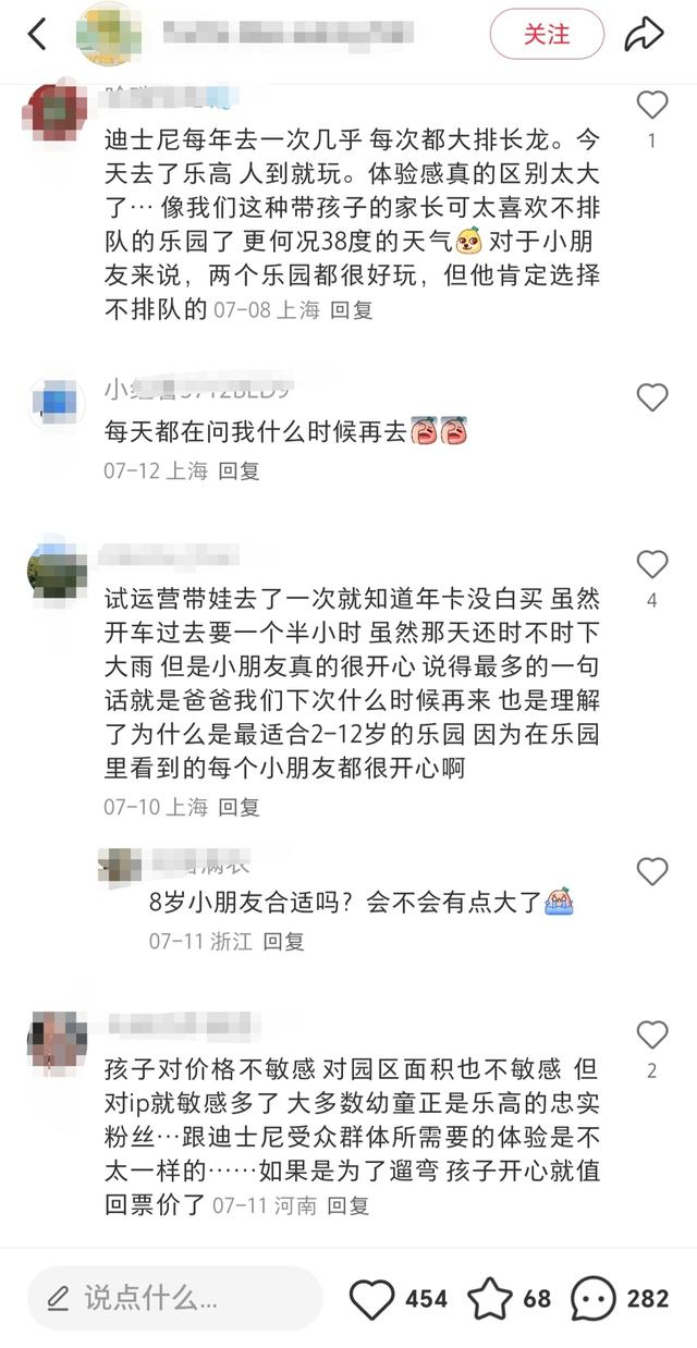 这记“组合拳”打出后,乐高乐园在社交平台上的游客口碑持续攀升,“带孩子首选乐高,所有项目几乎不排队”“餐饮半价真香”“6-10岁的男孩流连忘返不肯走”等评论刷屏。