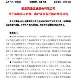 对于本次法人切换以及业务迁移合并,国泰海通证券明确了两个举措与态度。一方面,在实施法人切换、客户及业务迁移合并过程中,国泰海通证券主要业务与服务均可正常开展、不受影响;另一方面,法人切换、客户及业务迁移合并后,由国泰海通证券继续为原海通证券客户提供各类服务。公司强调,将稳妥有序推进本次法人切换、客户及业务迁移合并,保证客户服务的平稳正常进行,充分保障客户合法权益。