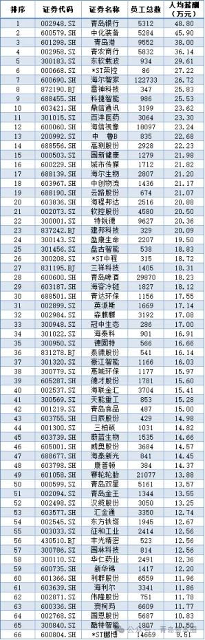 上市公司的薪资水平普遍高于其他类型企业。根据《青岛资本圈》统计,2024年,青岛辖区66家上市公司员工总数达34.87万人,人均年薪18.78万元。海尔智家是员工数量最多的青岛上市公司,员工总数达12.27万人,占青岛上市公司员工总数约1/3;青岛啤酒、赛轮轮胎、海信视像、*ST鹏博的员工总数也超万人;45家上市公司员工总数超千人。*ST荣控是员工总数最少的青岛上市公司,仅有86人。