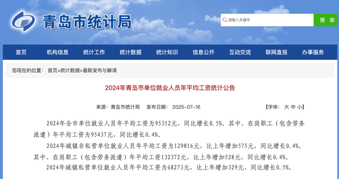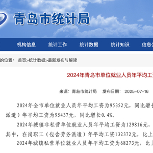 《青岛资本圈》了解到,7月21日,青岛市统计局发布的2024年青岛市单位就业人员年平均工资统计公告显示,2024年青岛市单位就业人员年平均工资为95352元,同比增长0.5%。其中,在岗职工(包含劳务派遣)年平均工资为95437元,同比增长0.4%。