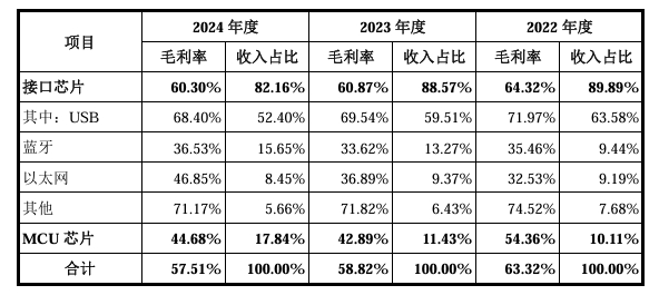 2024年,沁恒微主营产品的产量为3.28亿颗,销量为2.92亿颗,产销率为88.85%。然而,沁恒微主营业务毛利率却逐年下滑,2022年至2024年分别为63.32%、58.82%、57.51%。对此,沁恒微在招股书中表示,该公司蓝牙、以太网及MCU芯片增长率均高于毛利率相对较高的USB芯片,拉低了主营业务毛利率。